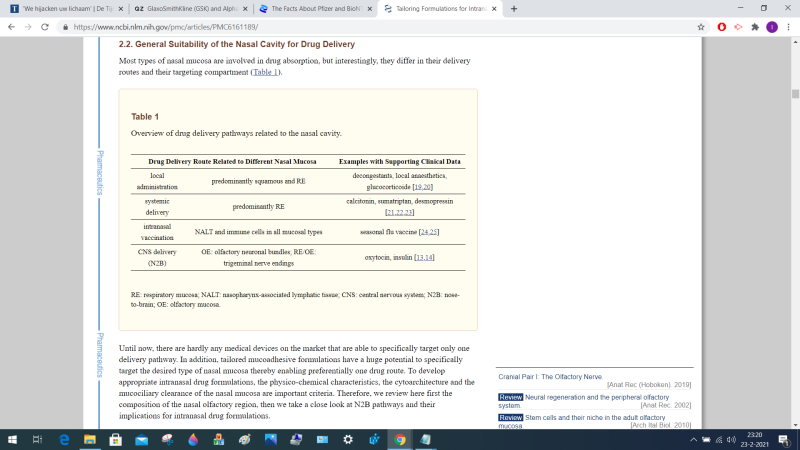 Beschrijving van toediening van medicatie direct tot de hersenen via de Blood Brain Barrier, het dunne membraan dat als filter dient voor de hersenen boven in je neus: precies tot waar de teststokken reikten.